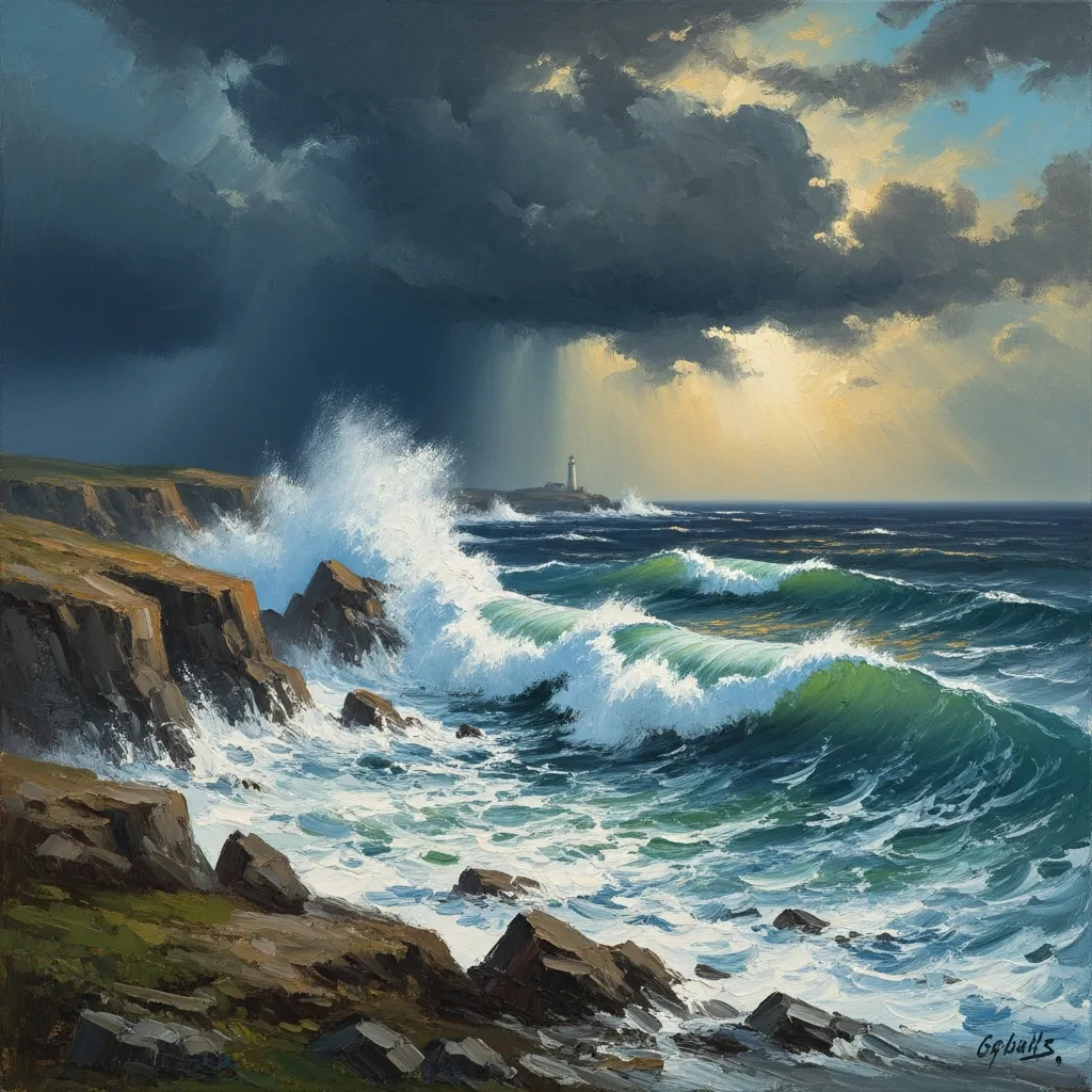 Dramatic ocean movement captured through impasto techniques, revealing strong understanding of water dynamics and texture building.